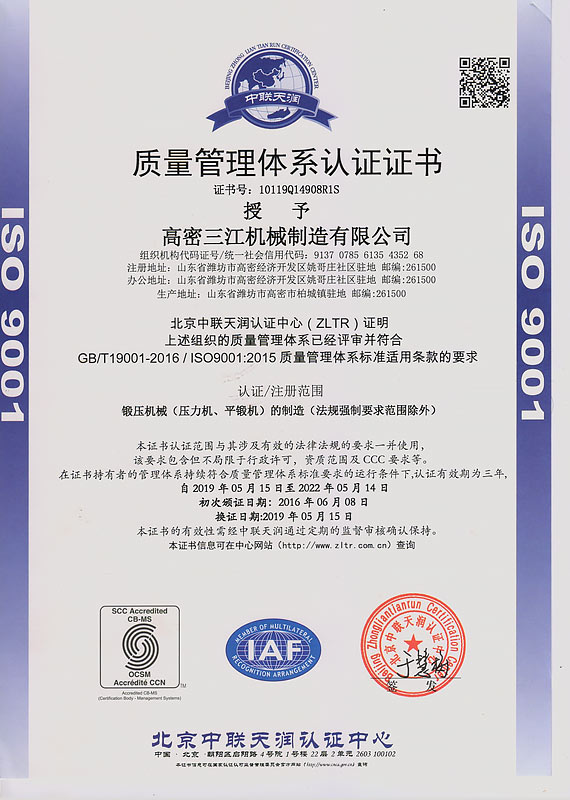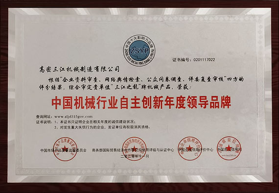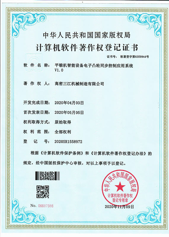 三江機械“以創(chuàng)新求發(fā)展”,注重知識產(chǎn)權(quán)申請和保護,近年來已獲得國家高新技術(shù)企業(yè)和山東省“專精特新”企業(yè),擁有ISO9001質(zhì)量管理體系認證和歐盟CE認證。公司注重研發(fā)創(chuàng)新,共引進國內(nèi)先進技術(shù)成果3項,取得發(fā)明專利5項,實用新型專利30余項,軟件著作權(quán)5項。先后與南京航空航天大學(xué)、山東理工大學(xué)、青島科技大學(xué)等高校在金屬成形工藝和新材料應(yīng)用等領(lǐng)域展開合作。